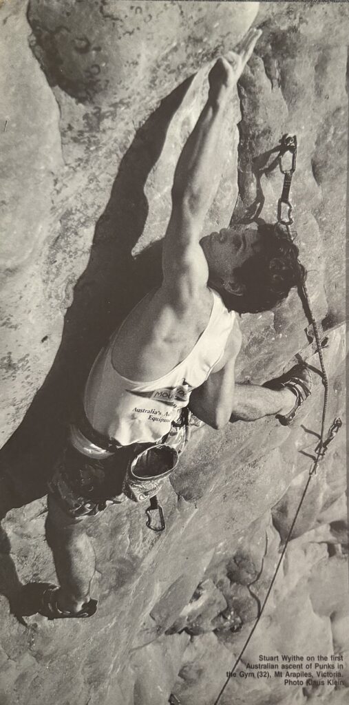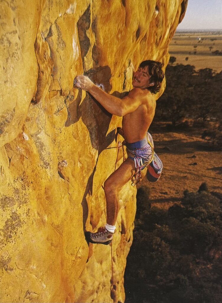 Wolfgang Gullich on the first ascent of Punks in the gym (31/32) Mt Arapiles Image by Heinz Zak
