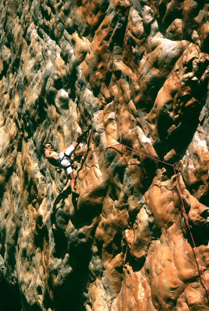 In 1985, Punks in the Gym (32, 8b+/5.14a) became the hardest route in the world, forever etching its name into climbing history. Located on the left face of the Pharos at Mount Arapiles. The line of Punks was conceived by Swiss climber Martin Scheel. While out climbing with Kim Carrigan and fresh off completing Masada (originally grade 30, now 29), Scheel began searching for a new project.