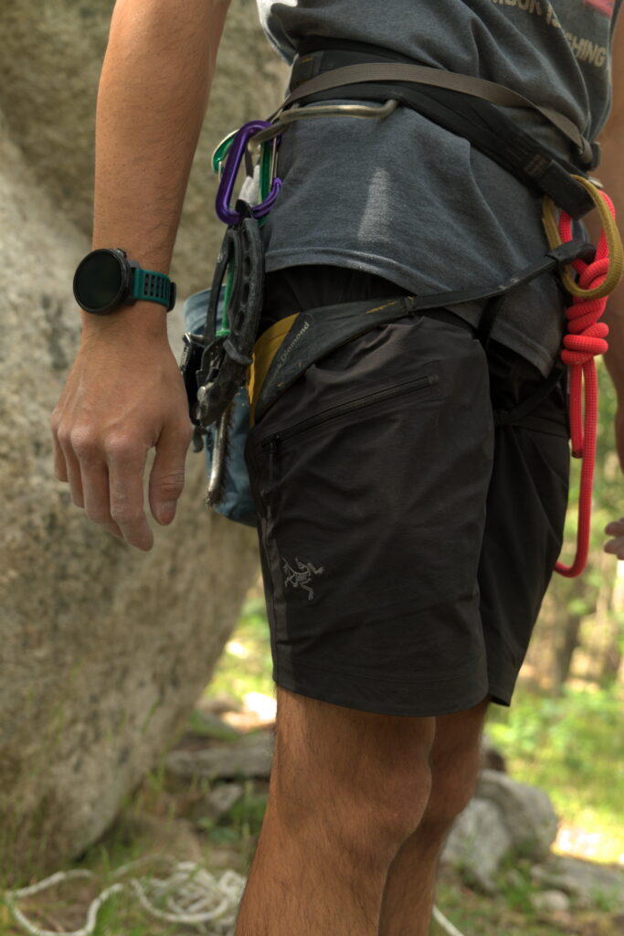 There are plenty of climbing shorts on the market: OR Ferrosi, Patagonia Terravia, Prana Stretch Zion, E9, Mammut Aenergy Light, etc. My issue with most of them is that the pockets aren’t well thought out and lack zips (a cardinal sin that goes double for climbing pants), and the few that do have zippered pockets are shaped so poorly that anything weighty runs around like a bull in a china shop. For the longest time, my favourite climbing shorts were a random pair made of Pertex that I picked up for cheap. They dried quickly, climbed well, and most importantly (for me), the zippered pockets kept my phone well positioned while in a harness… they have since fallen apart.