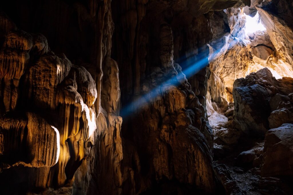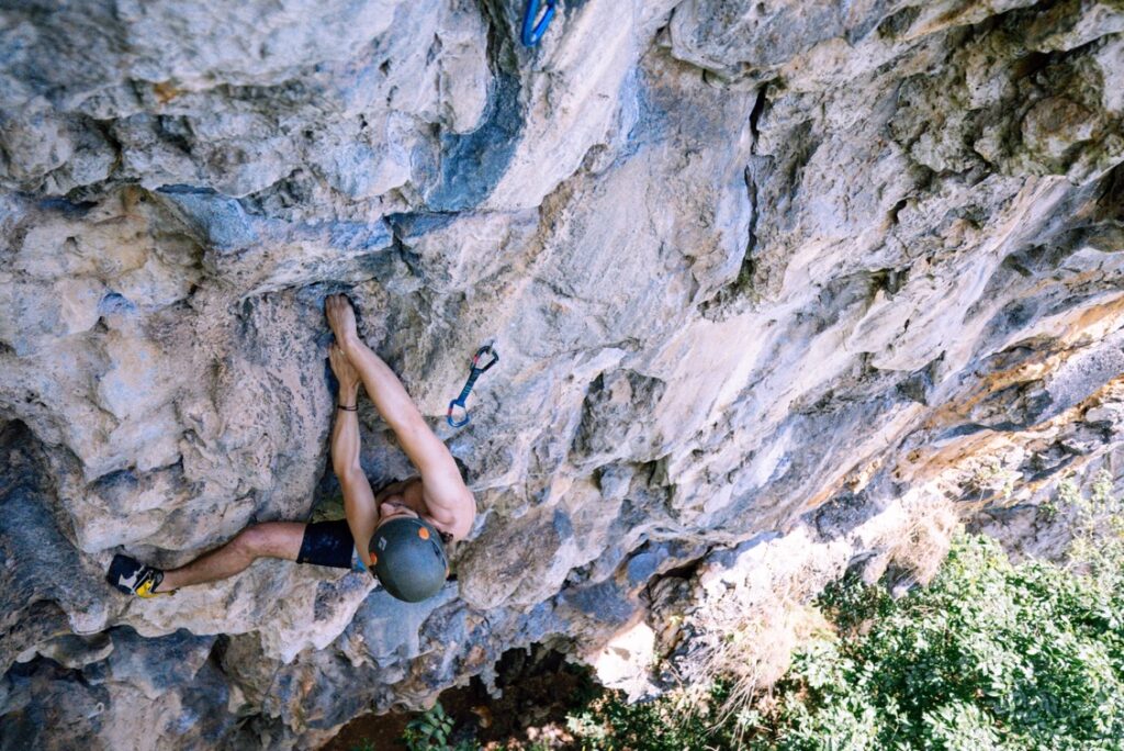 • Anxiety State Crisis – 42m, 7a/23. The scariest route I’ve ever tried. Even my local guide swears never to climb it again. If you’ve got hexes for nuts, start your adventure by scrambling and rappelling to a hanging belay on a limestone column. Traverse the roof, stepping across stalactites with a 50m drop beneath you. Then a pumpy but easier climb brings you into the sunlight, feeling alive (and mildly traumatized). These routes are for experienced pairs only. A light belayer might strand their leader mid-route if a fall happens in a tricky spot. Know how to ascend a rope or “boink” if needed—or Progression will need to send a rescue team.