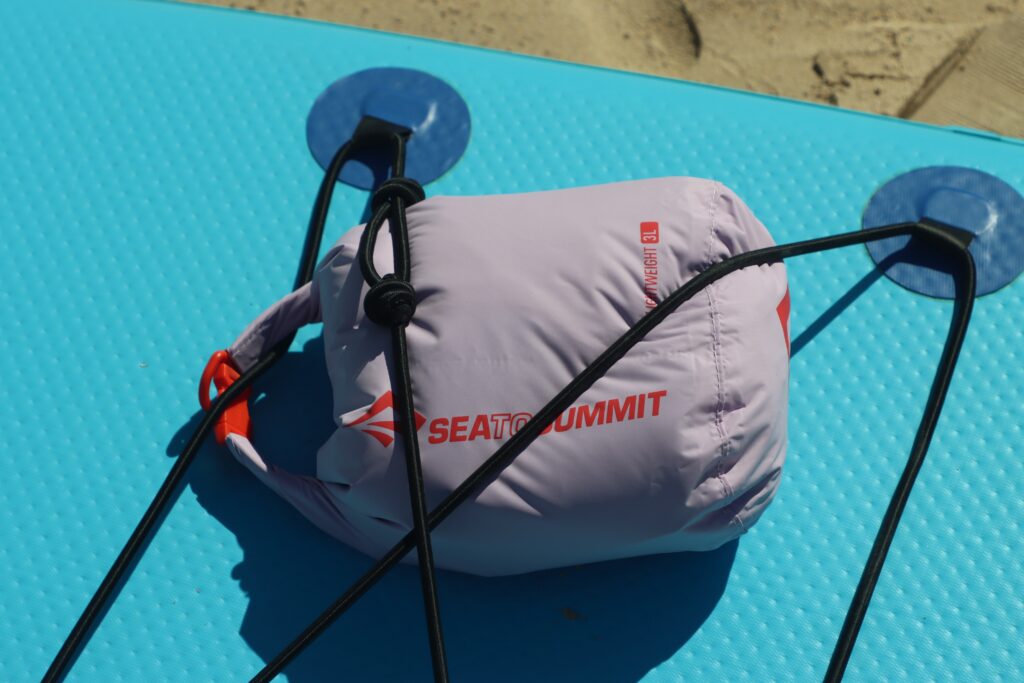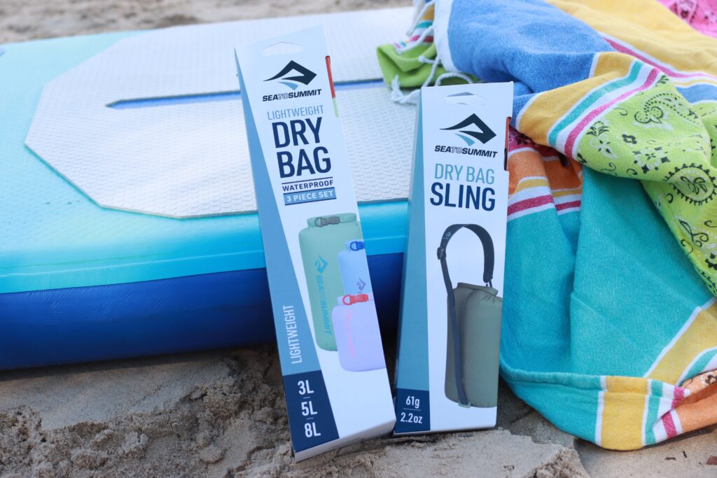 The Lightweight Dry Bags made of a durable 70D nylon and compatible with the Sea to Summit Dry Bag Sling, which keeps them nice and light and easy to carry.  It states in the instructions label that you should use two dry bags for sensitive electronic equipment, (which we neglected to read), but all of our gear stayed dry, even after getting soaked on the paddleboards.