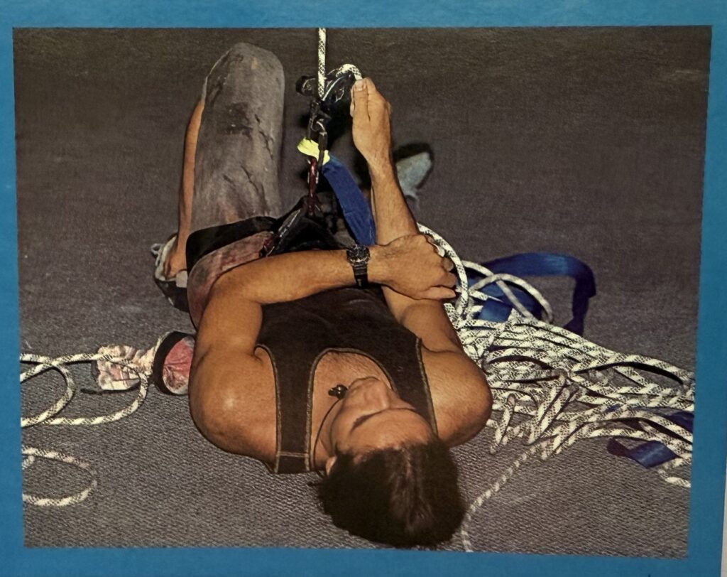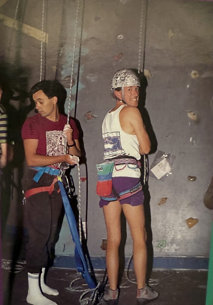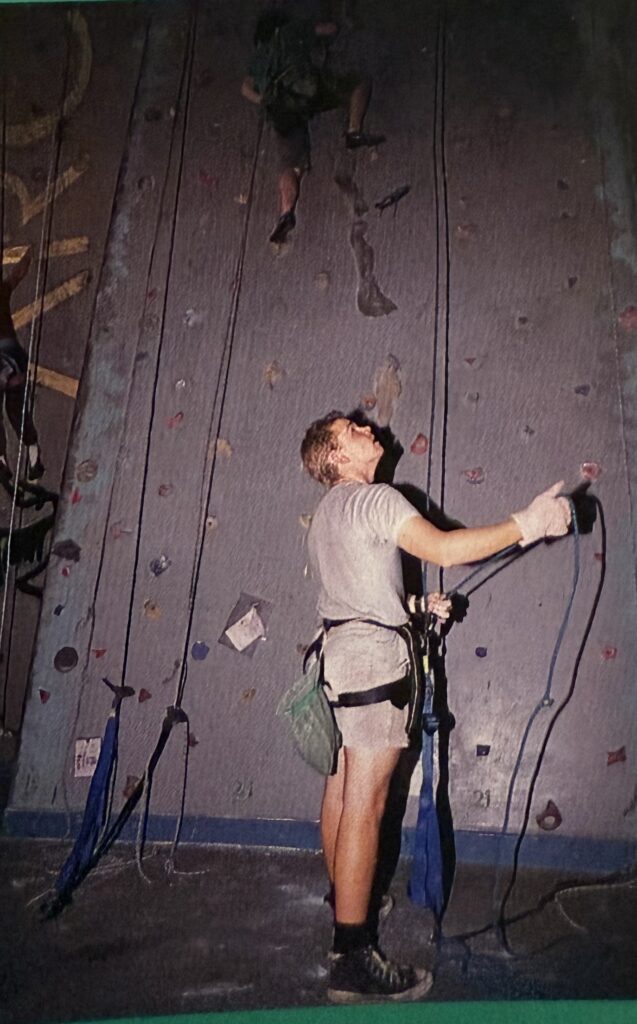 ‘I was surprised by the prices. You can climb for as long as you like for only eight dollars-that’s cheap in this day and age. I brought along my aerobics tights and leotard and for a little bit extra we hired some boots and a harness. Daryl had already done some climbing with the Scouts so he told me all about the calls and emphasised the importance of belaying. He said that good belay technique didn’t come overnight but was something I’d have to work on. So after the people showed us how to use the equipment we were left to our own devices.